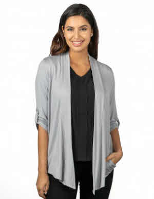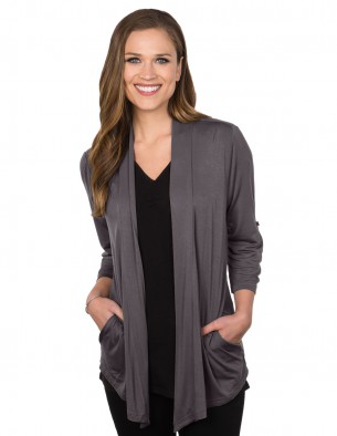 This beautiful cardigan is made from 95% rayon and 5% spandex making the material ultra soft in a smooth jersey knit. The 3/4 sleeves feature a button tab closure for extra adjustment and style. The extended collar is made with the same soft fabric and features an open collar. Two side pockets offer warmth and extra storage.